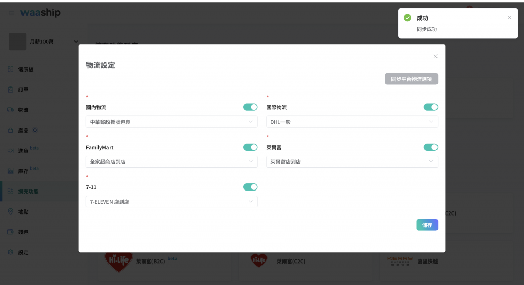 - 點擊「同步平台物流選項」即時同步 Shopify 上的物流服務
