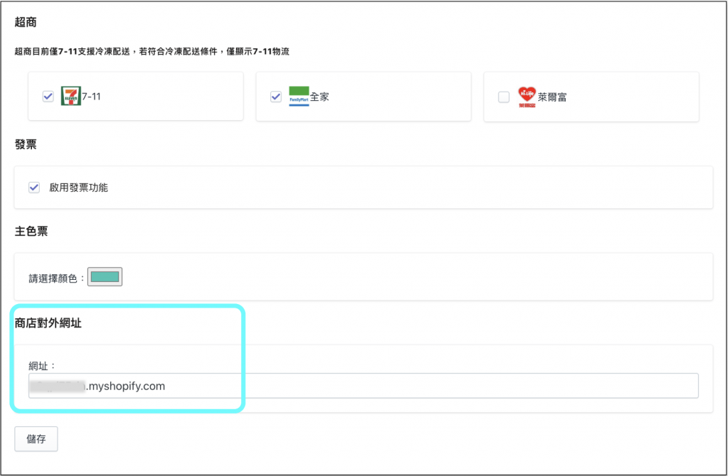 - 在「商店對外網址」欄位中,填入商店對外網址(不包含 http:// 或 https://)