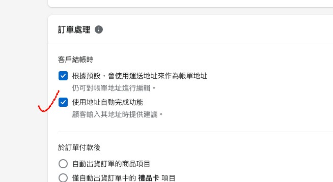 建議您在shopify-[設定]-[結帳]-[訂單處理] 客戶結帳時 關閉「使用地址自動完成功能」選項。
