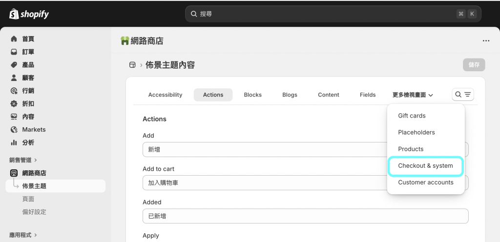 1. 進入 Shopify 後台,依序點選「網路商店」>「佈景主題」。