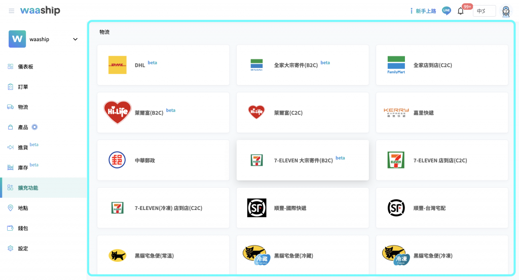 • 至 waaship 管理後台「擴充功能」下方「物流」選項申請開啟您要使用的所有物流服務