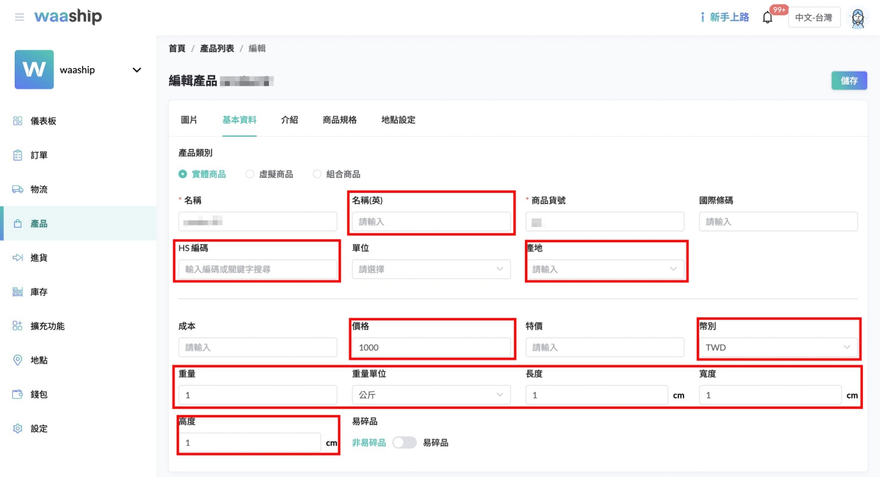 4. 跨境出口商品須新增產品英文名稱(通常僅於waaship設定)、重量、產地、HS code(國際商品統一分類代碼)等才能收單出貨,請於銷售前確認平台及waaship的相關欄位是否皆已填寫。
