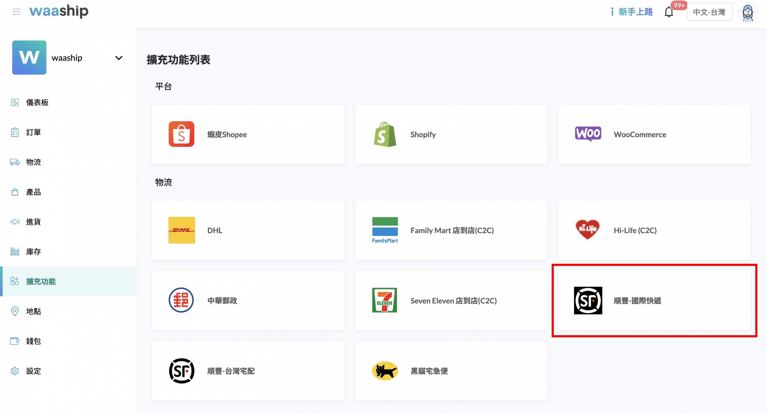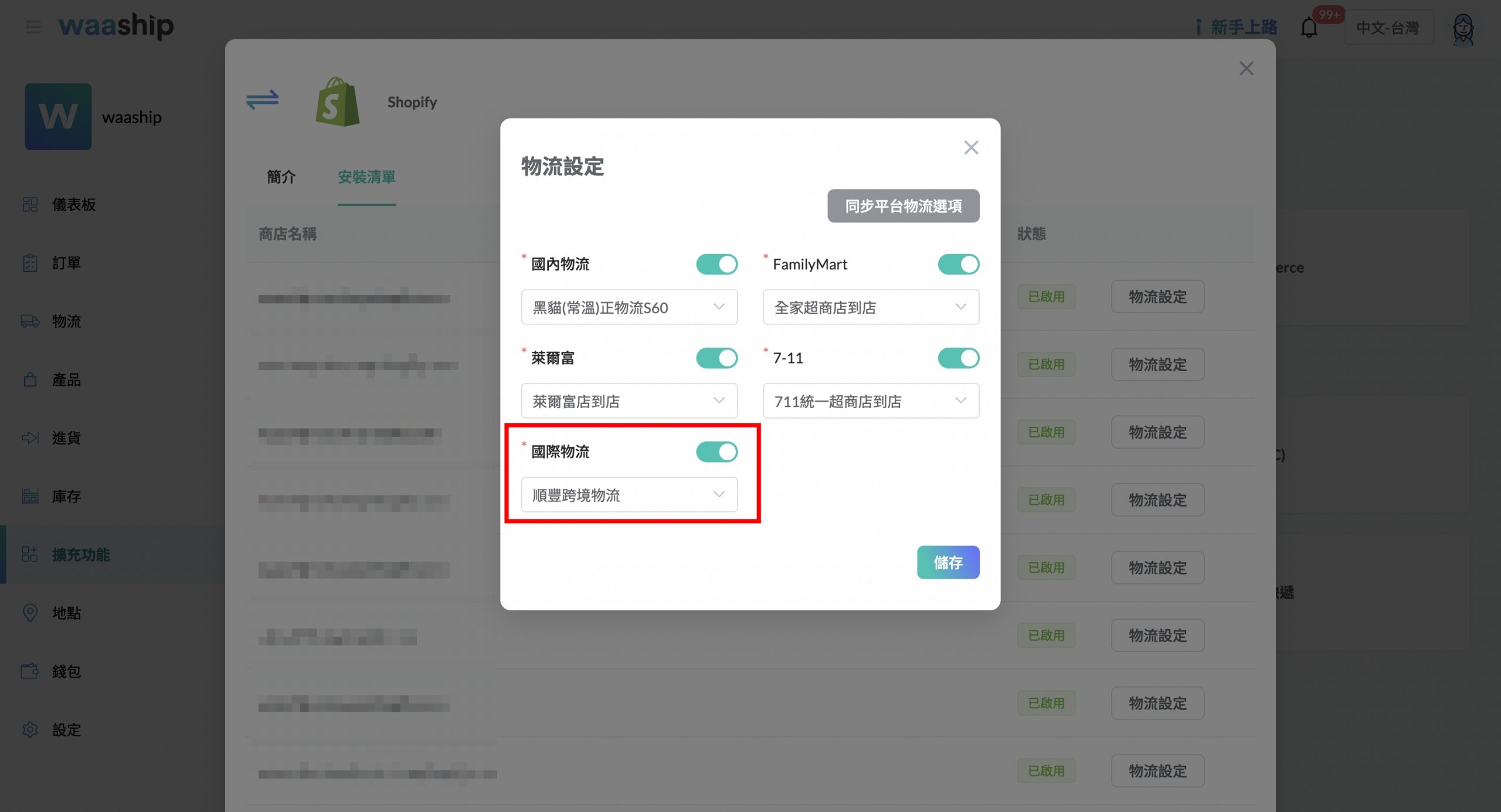 7. 在waaship【擴充功能】-【平台】選擇有啟用順豐跨境物流的平台,至【安裝清單】-【物流設定】設定相關選項(下圖以shopify為例)