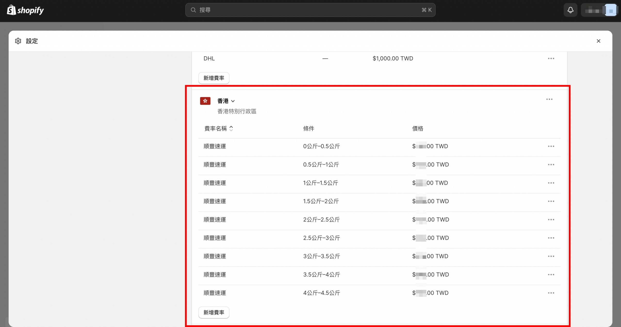 賣場設定運費範例(以shopify設定香港運費為例。再次提醒:須設定商品及包材重量才可以正確計算跨境運費。)