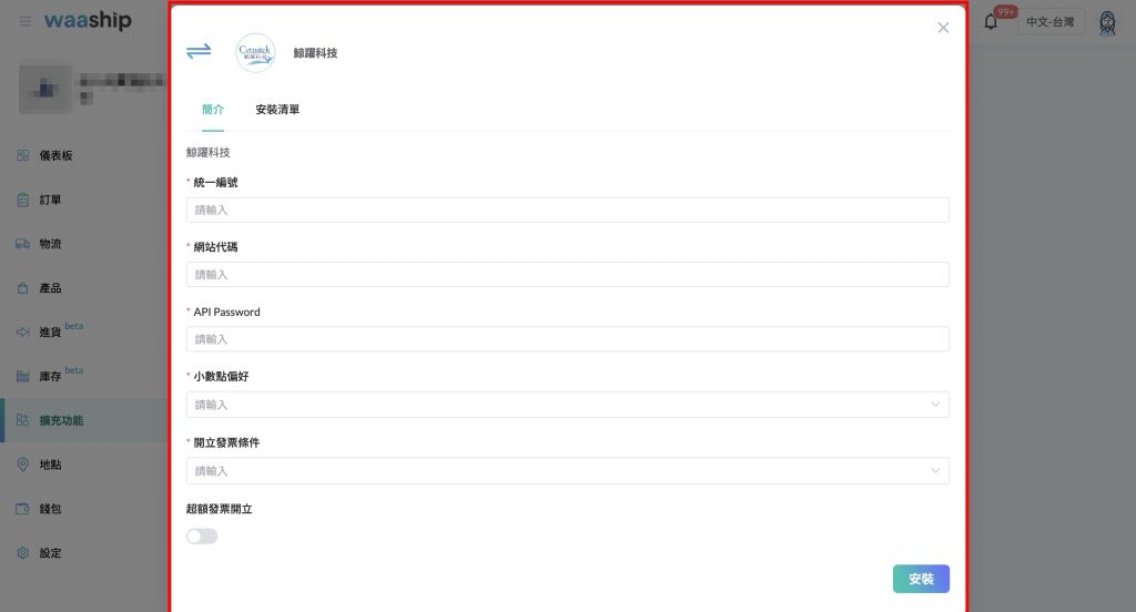 - 在waaship【擴充功能】-【電子發票】-【鯨躍科技】填入下圖所需資訊。